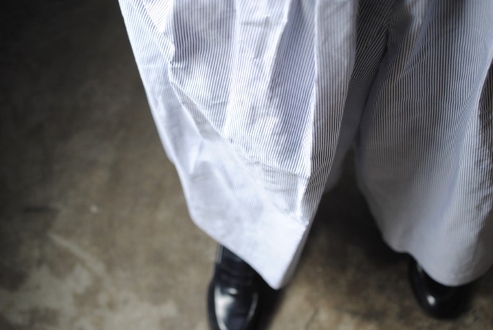 ワークペインターのようなシルエットながら、ワイドトラウザーとも思えます。