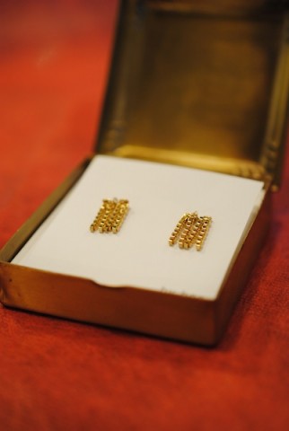四角と四角が交互に編み合わされたベネチアンチェーン使いのピアス。