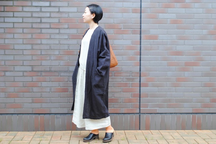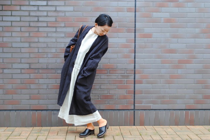 ワークコートのようでワンピース、フロントを開けてコート風に着てみました。