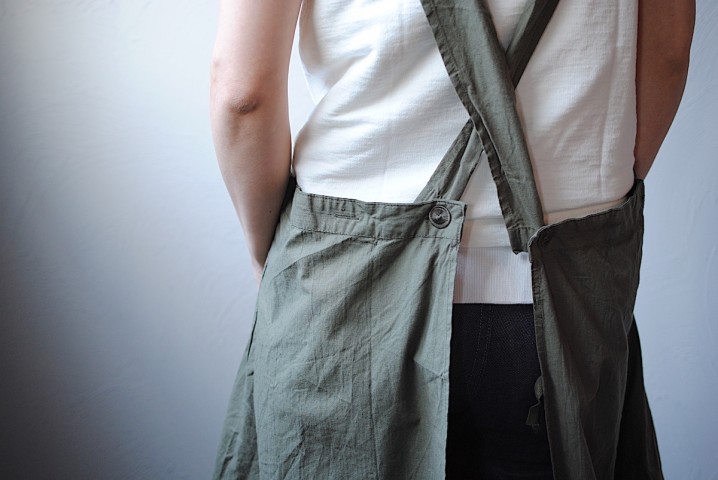 染色してカーキ色をまとった、ワンピースのようなエプロンです。