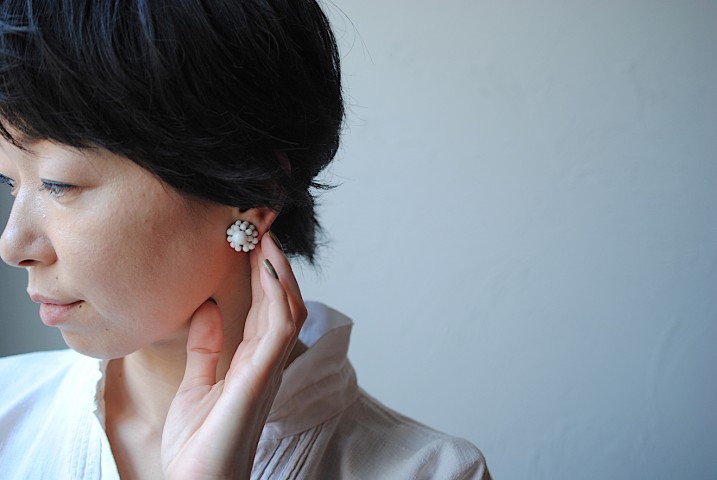 ピラミッド状に突起した白いガラスビーズイヤリング、