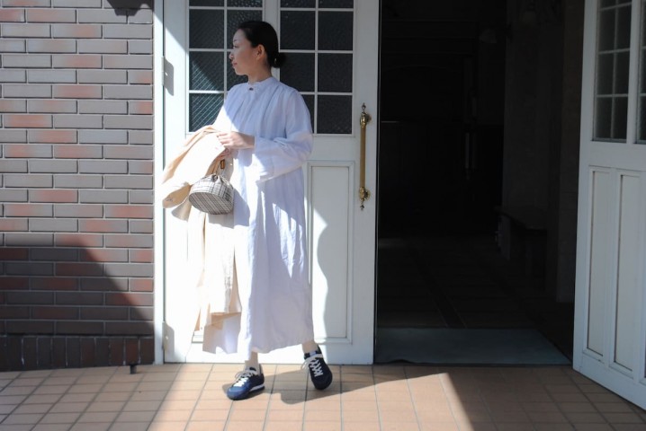 軽く羽織ったコートの中には個性のビンテージワンピース。