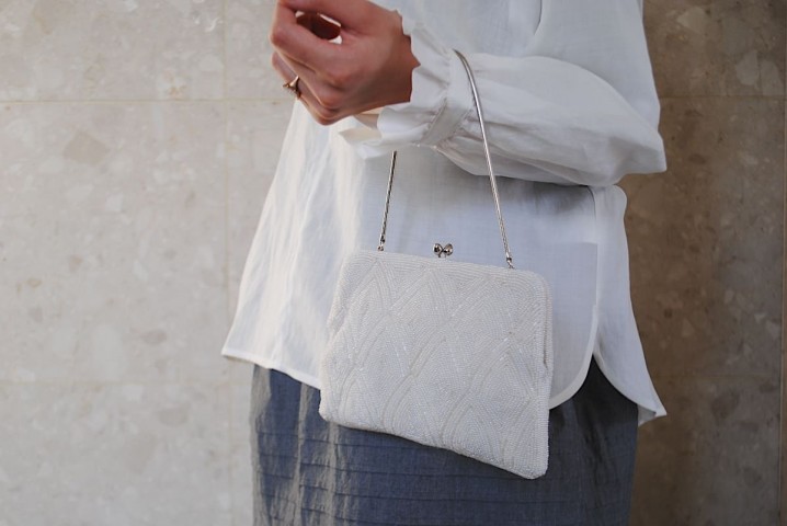 とても細かなビーズでデザインされたガマ口のポーチバッグ。
