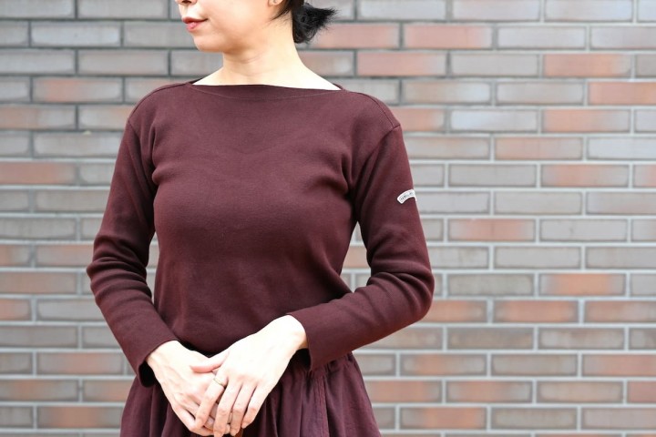 鎖骨のラインに沿って横長に緩くカーブのかかったネックラインが特徴です。