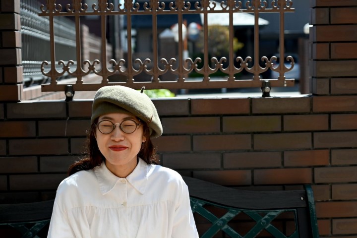 凹みを一箇所作る被り方は、ちえさんのお気に入り。