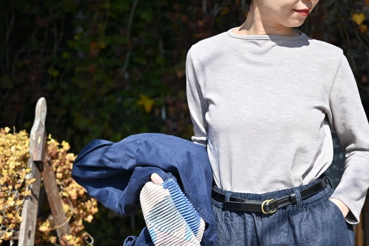 ベルトでワンアクセントを入れて、ちょっとそこまでの外出も品よく整います。