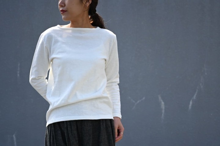 カジュアルな印象の生地感ですが、開きすぎないボートネックがとても綺麗。