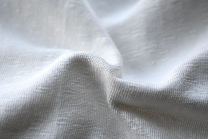 旧式の編み機によってゆっくりと高密度に編み立てられる上質な素材 ”超高密度度詰天竺スラブコットン”