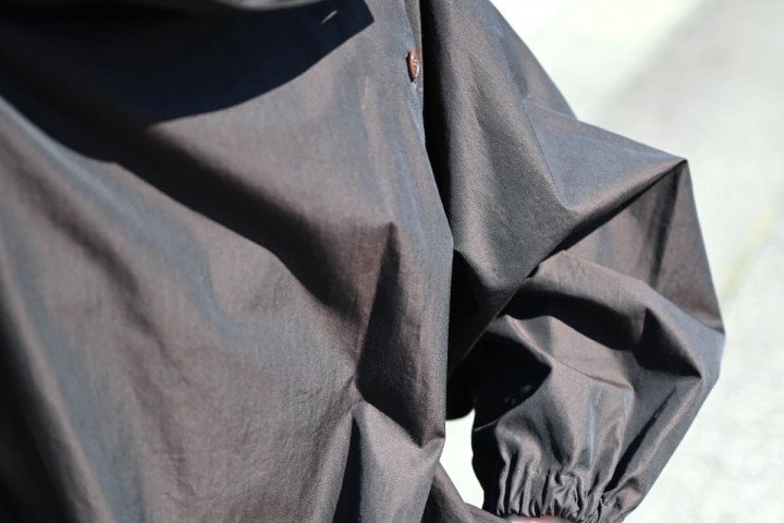 サイドから見ると裾広がりになった幅広の作りと、脇下に向かって強弱のあるカフスが、腕をほっそりと見せてくれます。