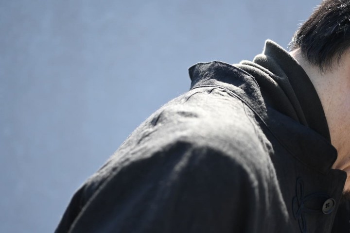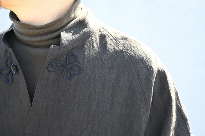 コアなミリタリーアイテムにみるようなデザインで、一見するとチャイナ服っぽくもあるジャケット。