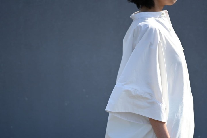 タイプライターのハリのある生地と、バンドカラーのおかげ。