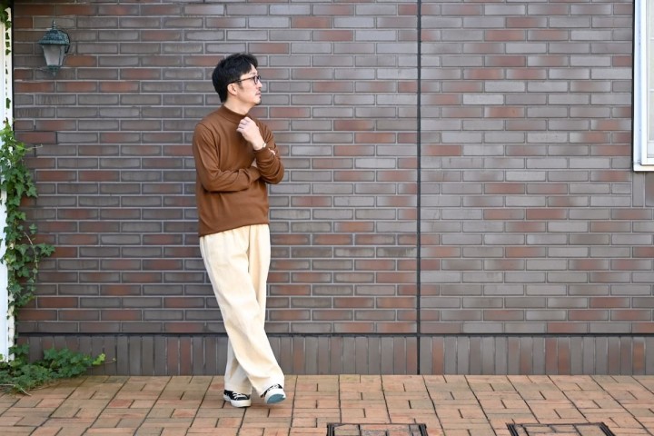 ボトムスには、pritのモールスキンパンツを合わせて、