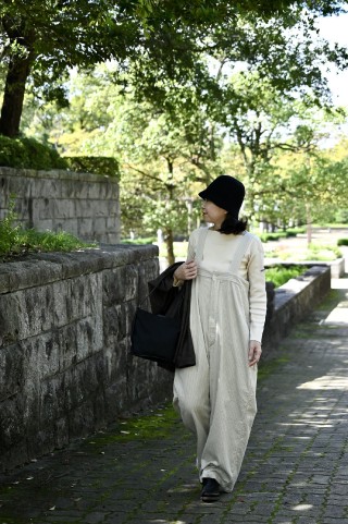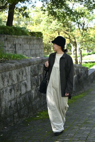 この日は生成りのカットソーに、同じく「YARMO」のコーデュロイサロペットを合わせて。