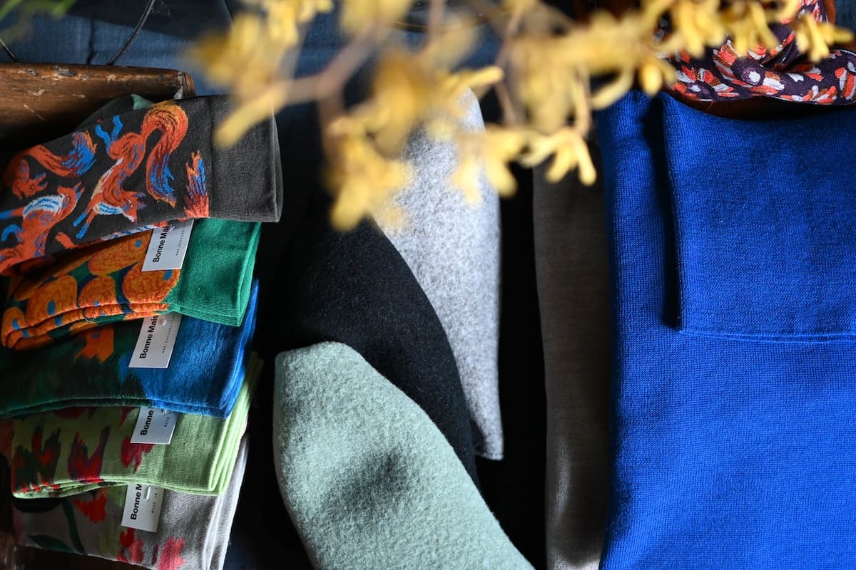 各地から届く、帽子、ストール、ハイゲージのメリノウールなどの品々。